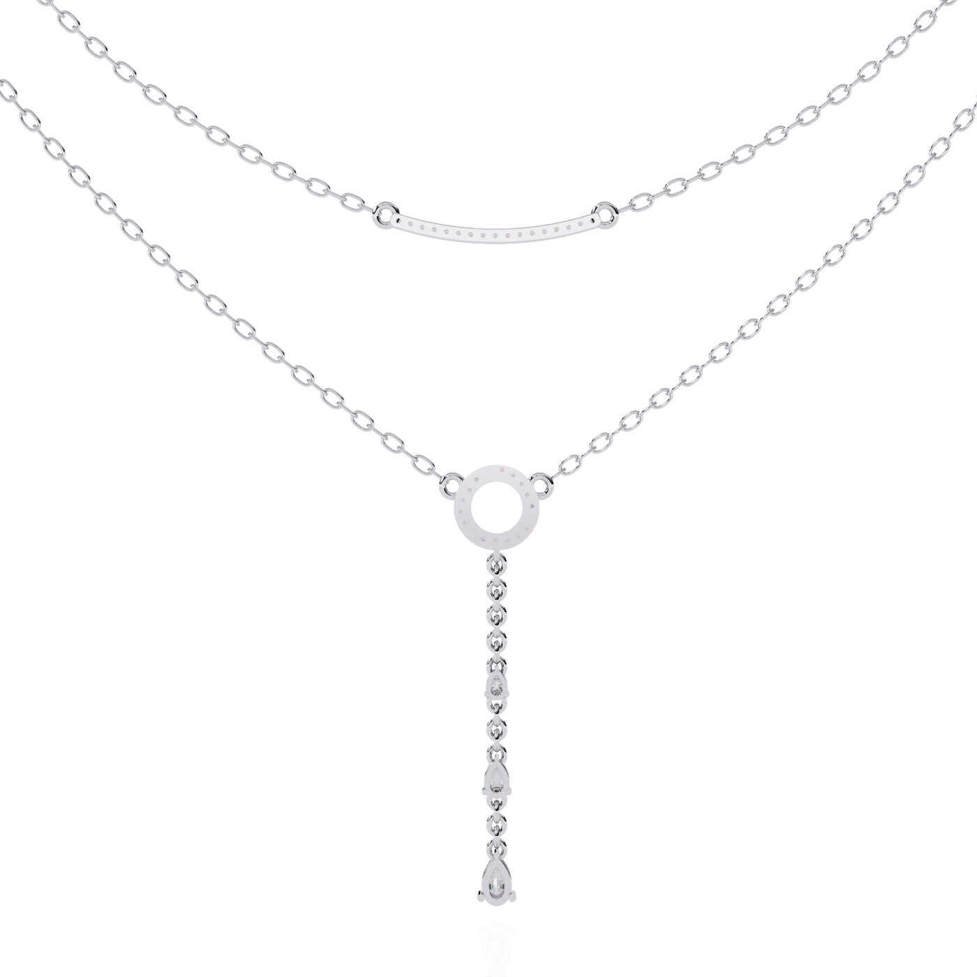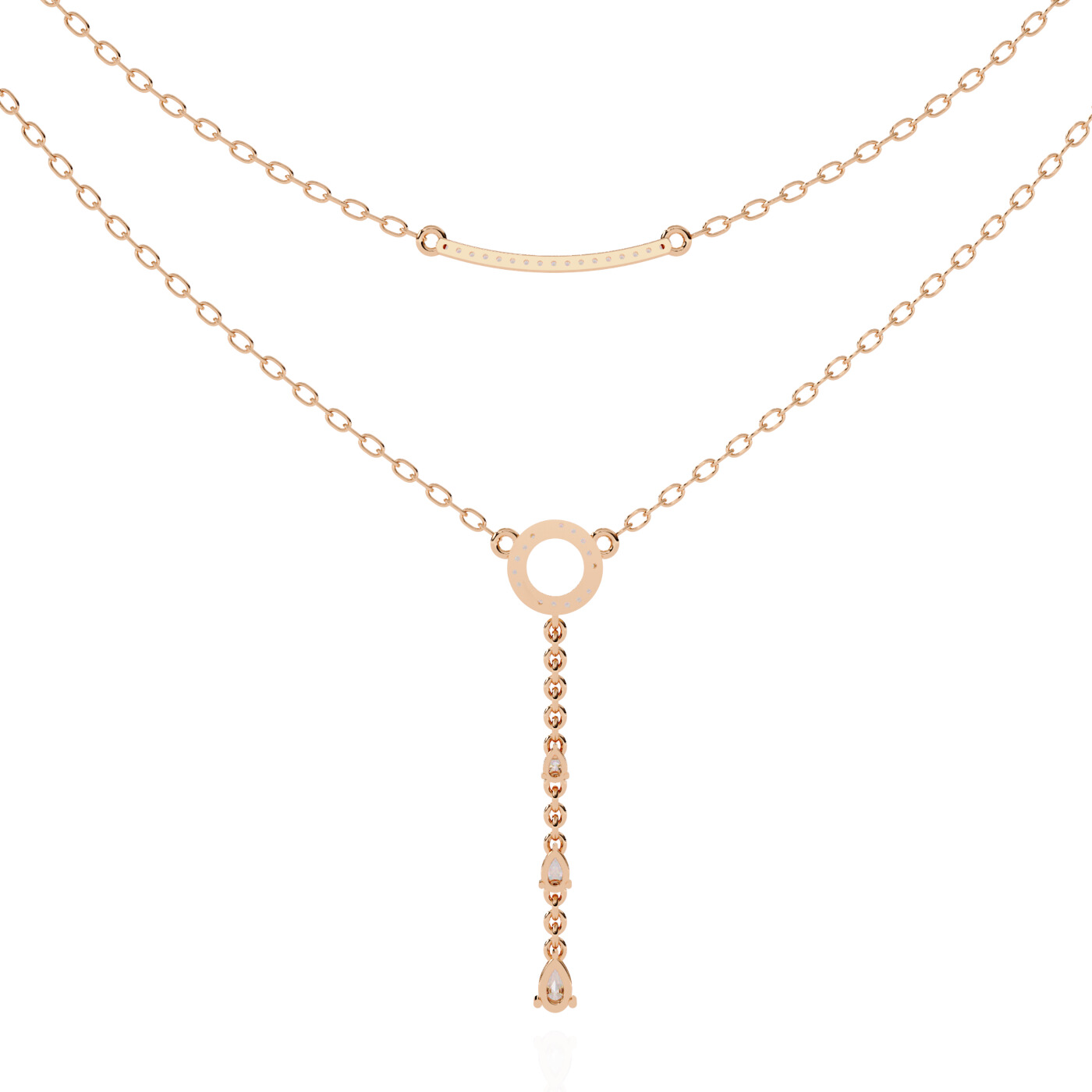Striking yet refined, the Drop Charm Layered Necklace from Nazara captures modern minimalism with a graceful edge. Designed in warm rose gold, the upper chain features a smooth, curved bar accent, while the lower chain holds a circular charm and a vertical drop of bezel-set lab-grown diamonds in elegant pear and round cuts. This layered Y-design flatters all necklines, making it the perfect finishing touch for both casual and dressy looks. Style meets sustainability in this ethically crafted statement piece.
