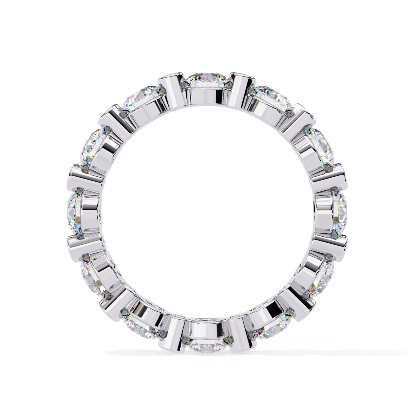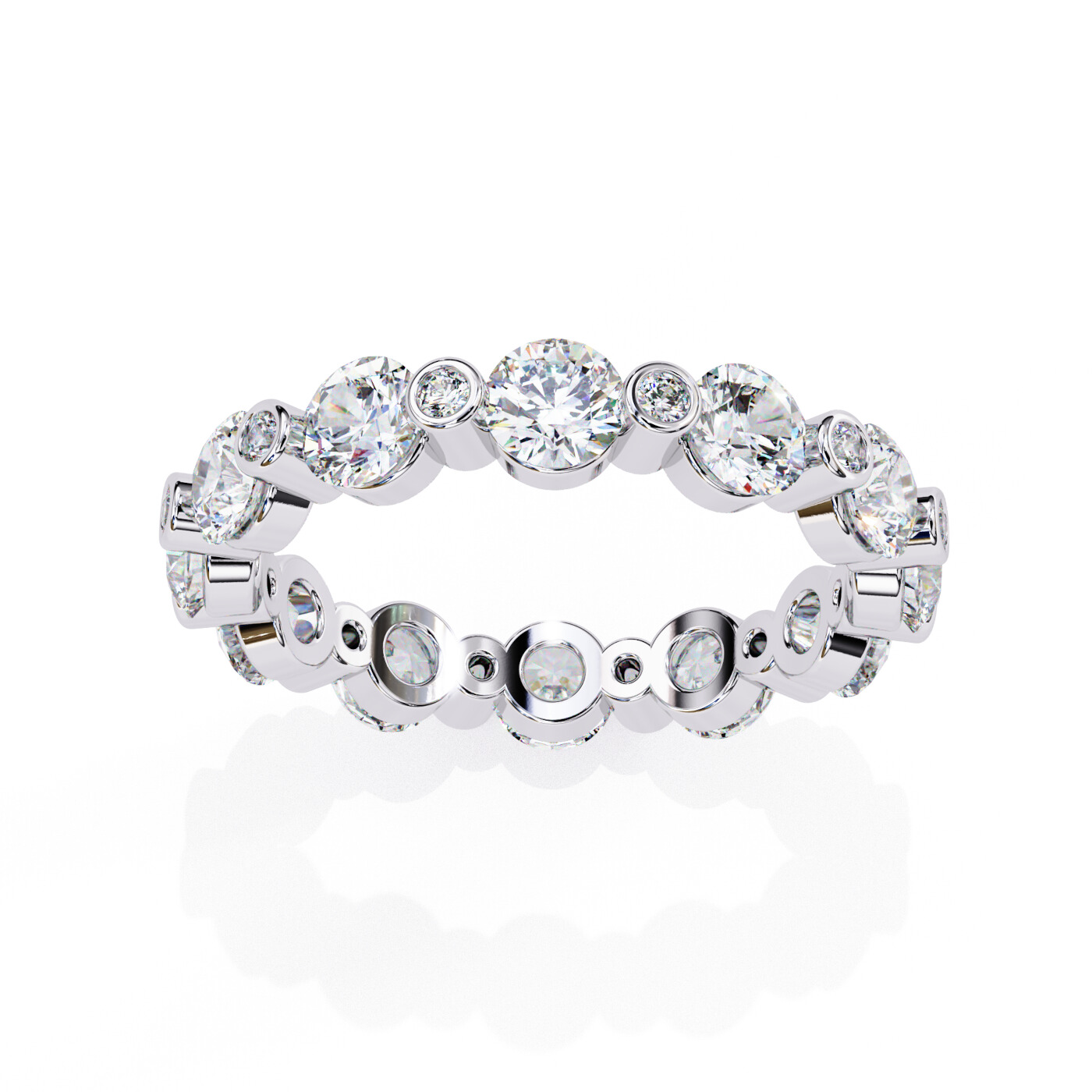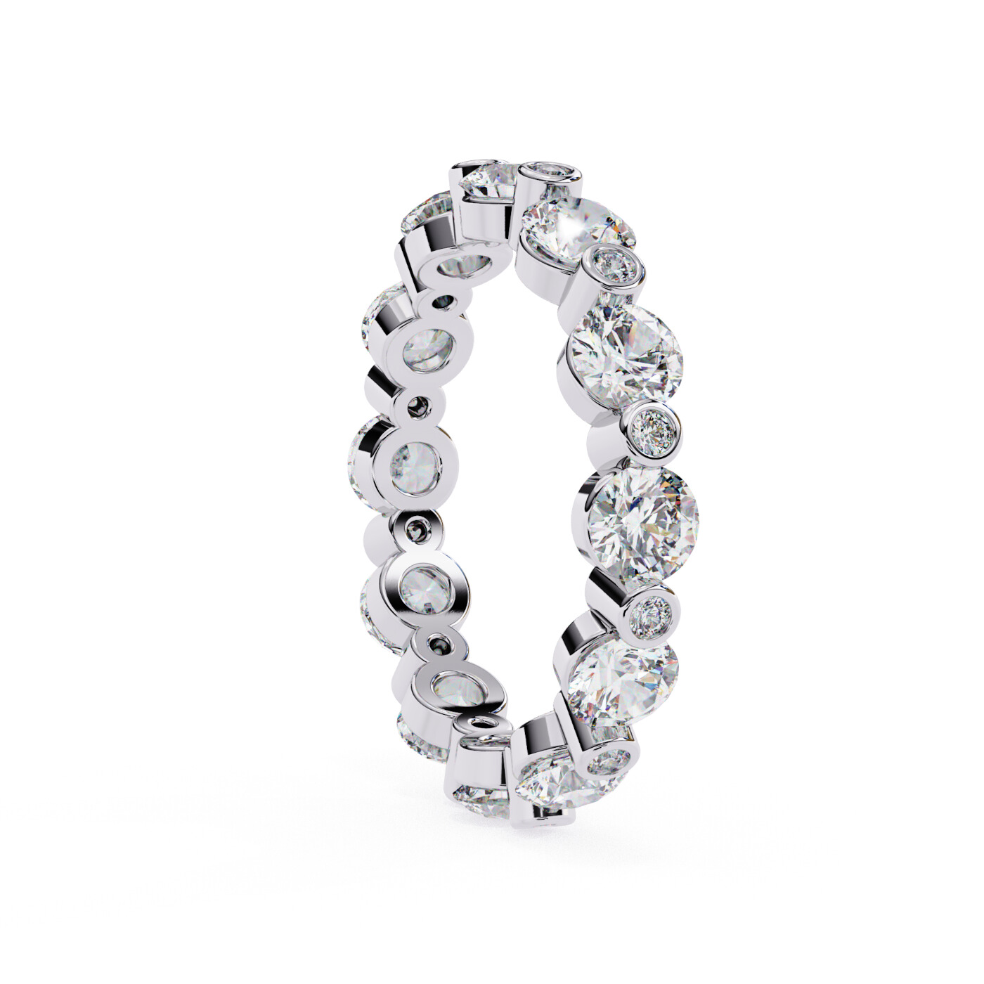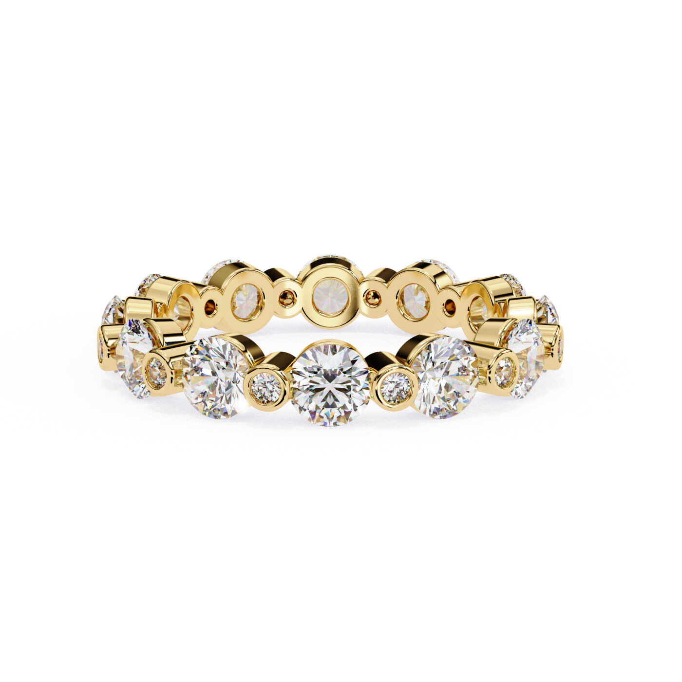 A striking eternity band showcasing alternating large and small round lab-grown diamonds in double bezel-style settings for a bold, modern profile.