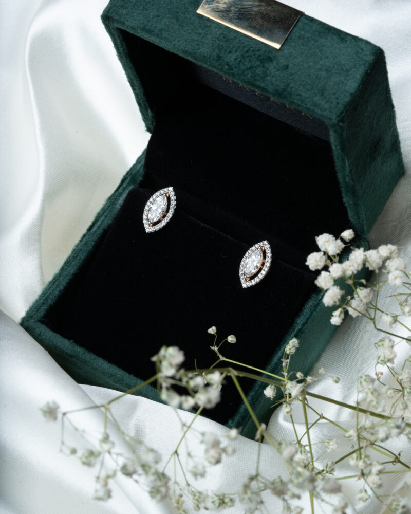 A graceful expression of elegance, these 14kt rose gold studs feature a dazzling marquise-cut lab-grown diamond encased in a shimmering halo of smaller diamonds. The delicate contrast of gold tones enhances the brilliance of the center stone, making these earrings a timeless statement of sophistication.