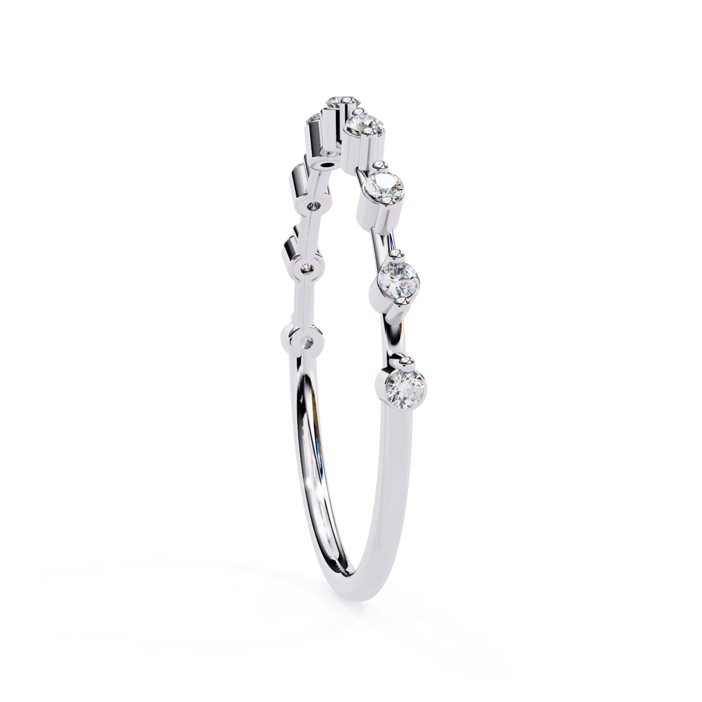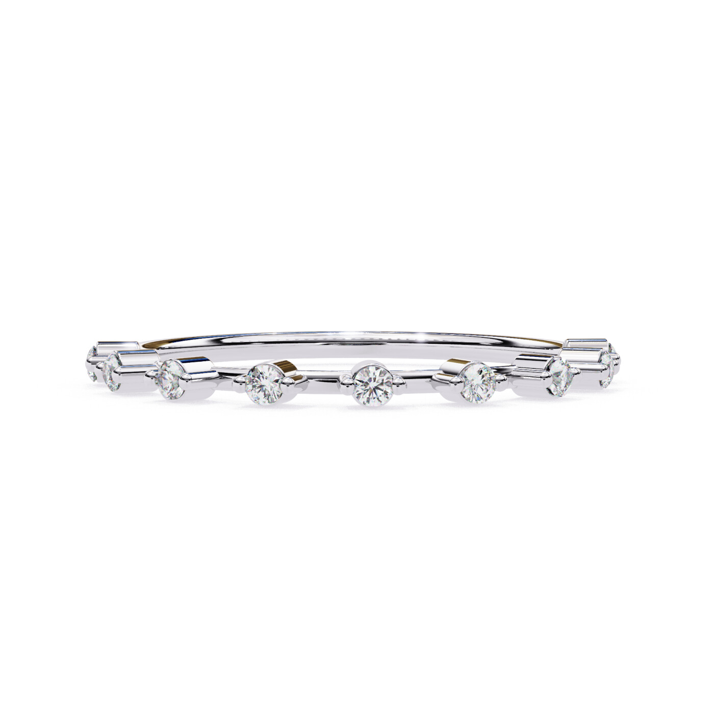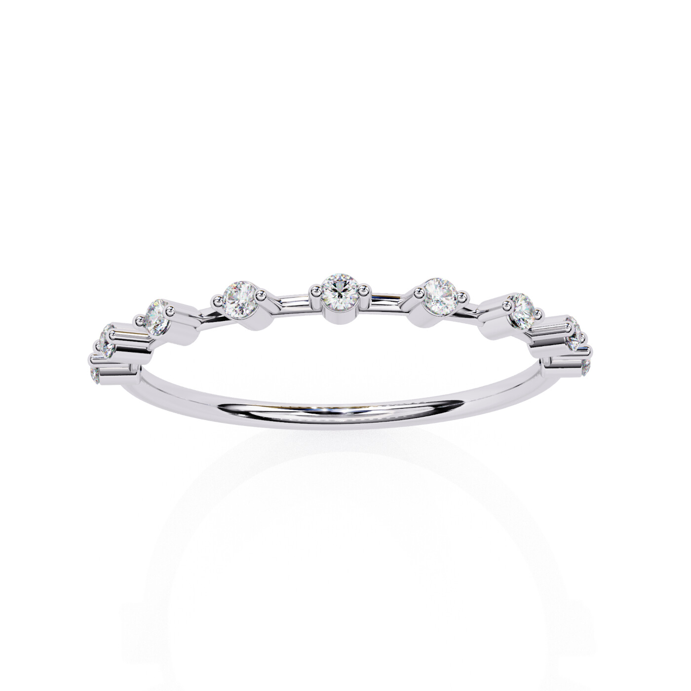 Metal: 14K White Gold, Gold Weight: Approx. 0.72 grams, Diamond Type: Lab-Grown Diamonds, Total Diamond Weight: 0.11 carats, Diamond Shapes: Round, Total Diamonds: 9 stones (1.50 × 1.50 mm) – 0.11 ct total, Ring Style: Minimal prong-set diamond band.