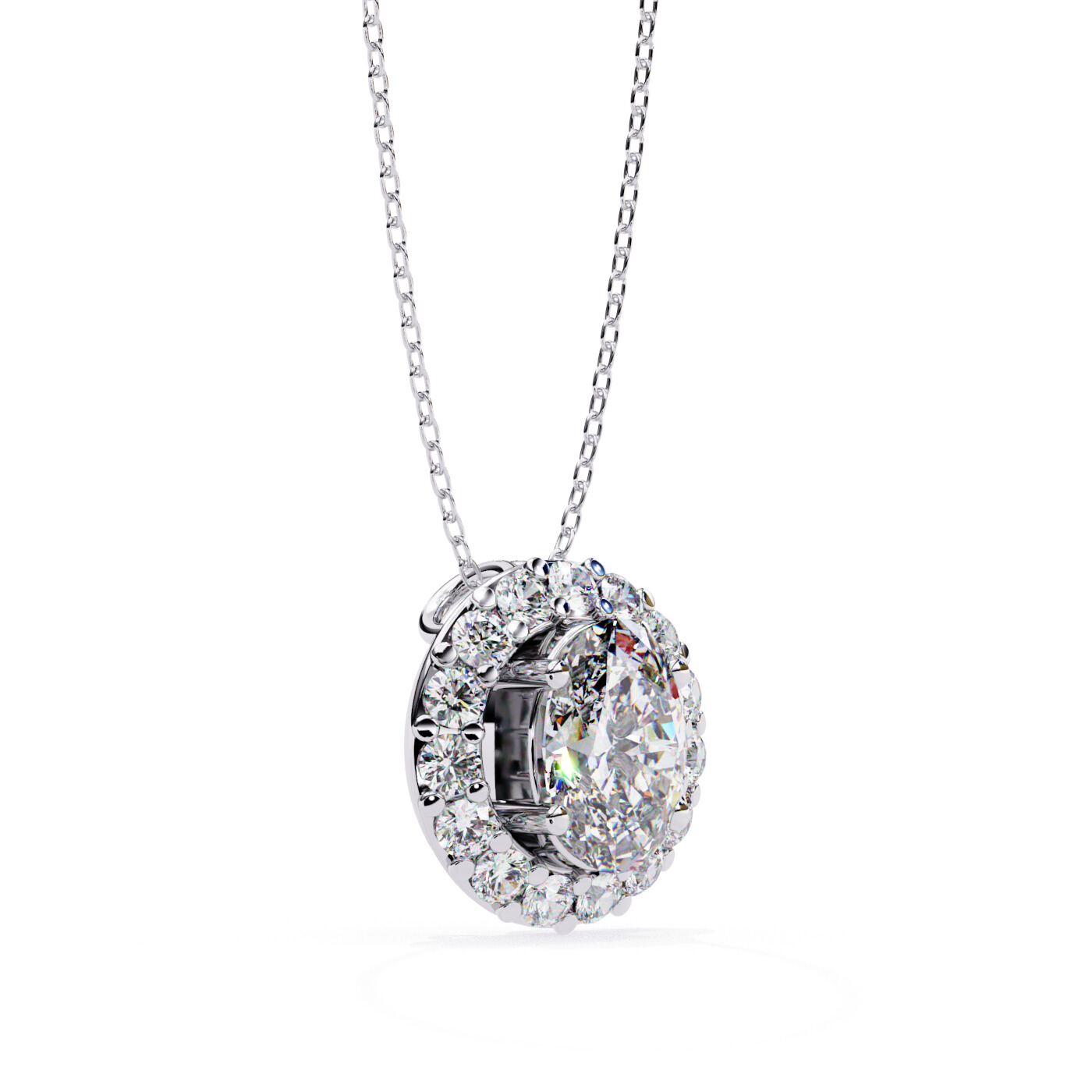 The Oval Radiance Pendant combines a vibrant oval lab-grown diamond with a sparkling halo, creating a refined statement for any occasion.