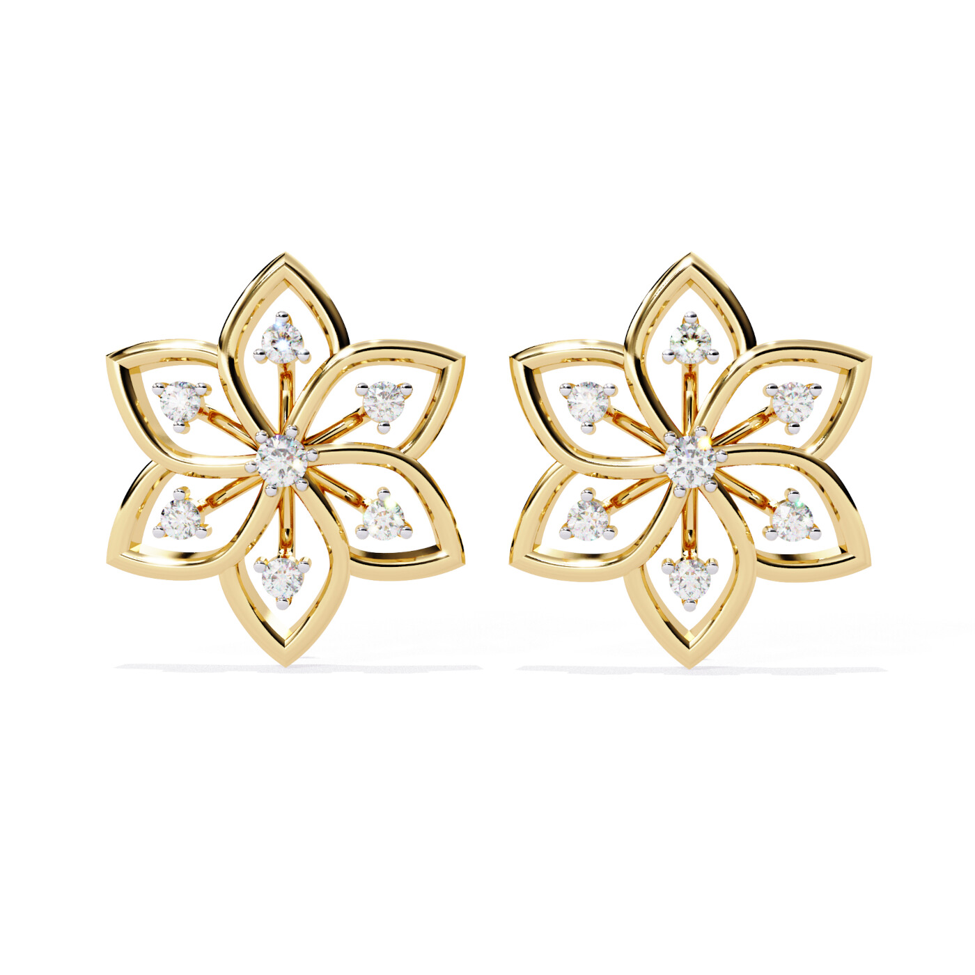 Charming and artistic, the Petal Flare Studs by Nazara Diamonds are inspired by blooming florals. Crafted in warm yellow gold, these earrings feature a dynamic six-petal openwork structure accented with lab-grown round diamonds. With delicate symmetry and a soft sparkle, they’re perfect for adding a graceful finish to your everyday or festive wardrobe.