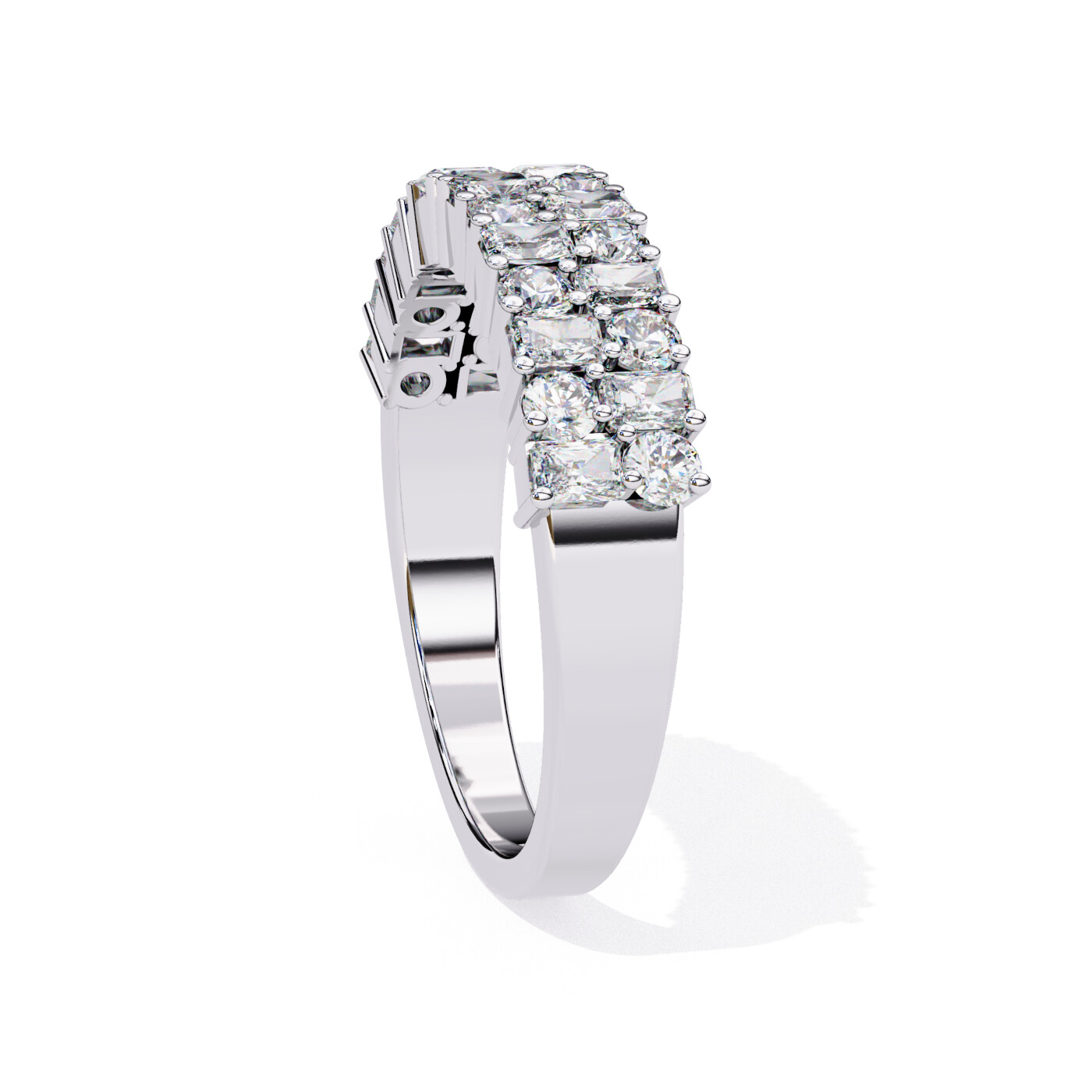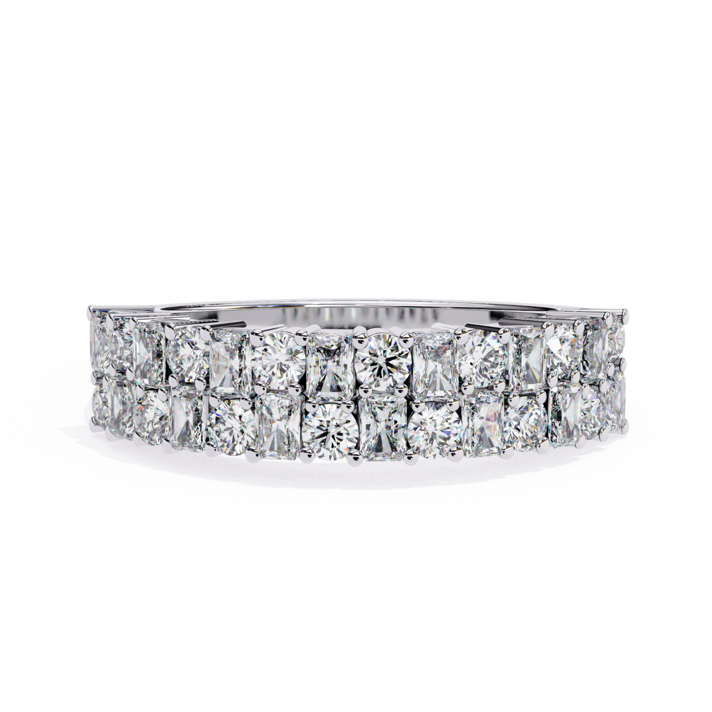 This elegant radiant diamond band features alternating rows of radiant and round lab-grown diamonds for a bold, timeless style. Perfect for stacking or as a statement on its own.