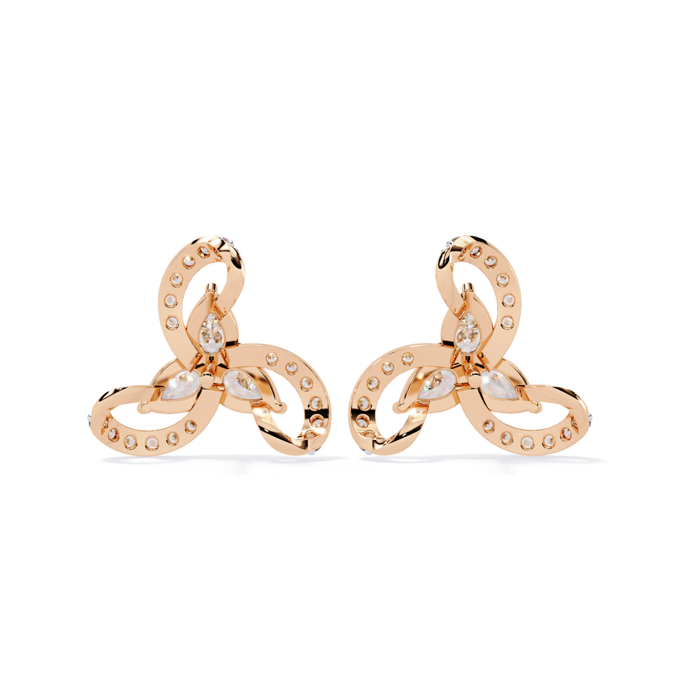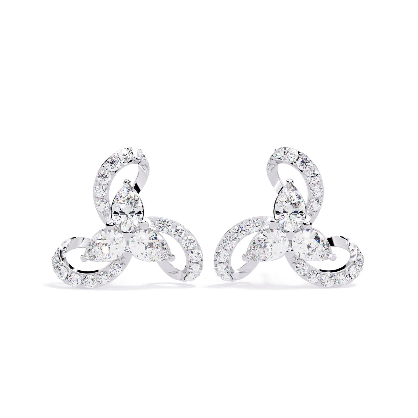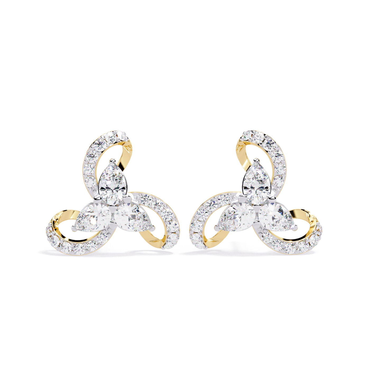 Playful yet poised, the Trinity Spark Studs by Nazara Diamonds showcase a unique three-loop form, each adorned with shimmering lab-grown diamonds. A central pear-cut diamond anchors the design, surrounded by delicate round stones that enhance the curves. These studs are a modern take on symmetry and elegance, ideal for both everyday polish and festive flair.