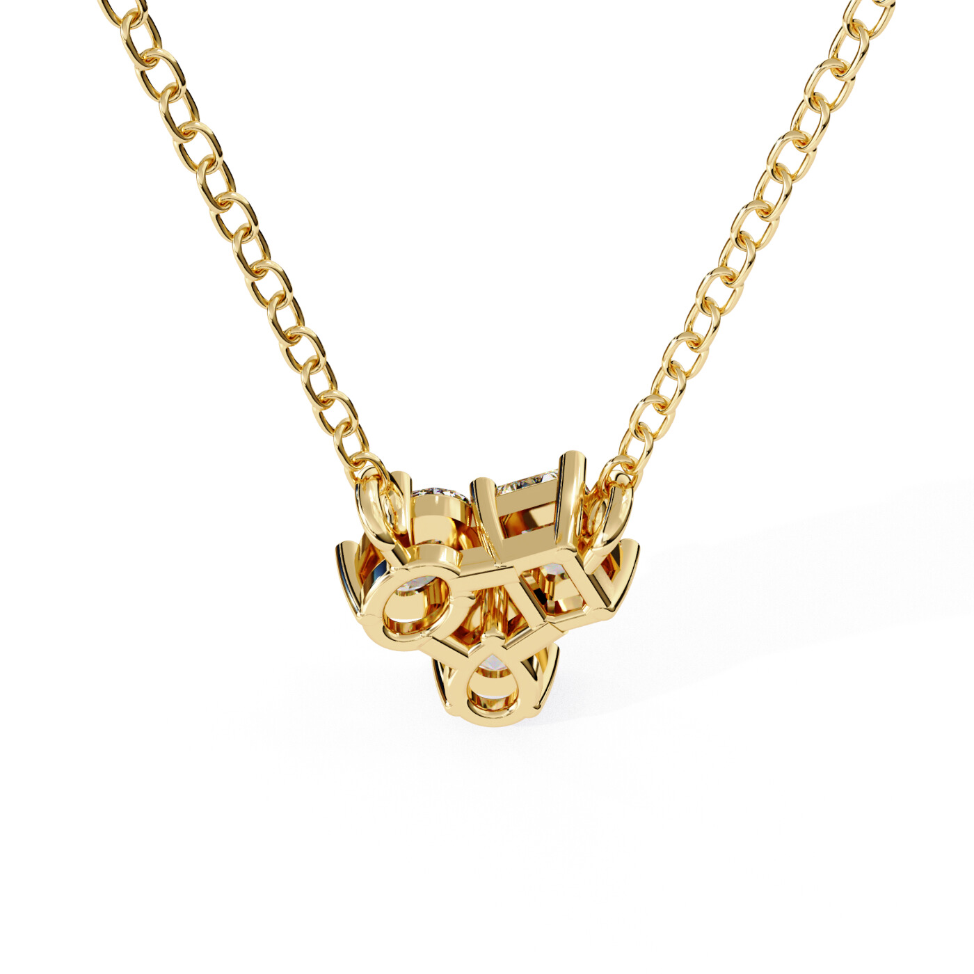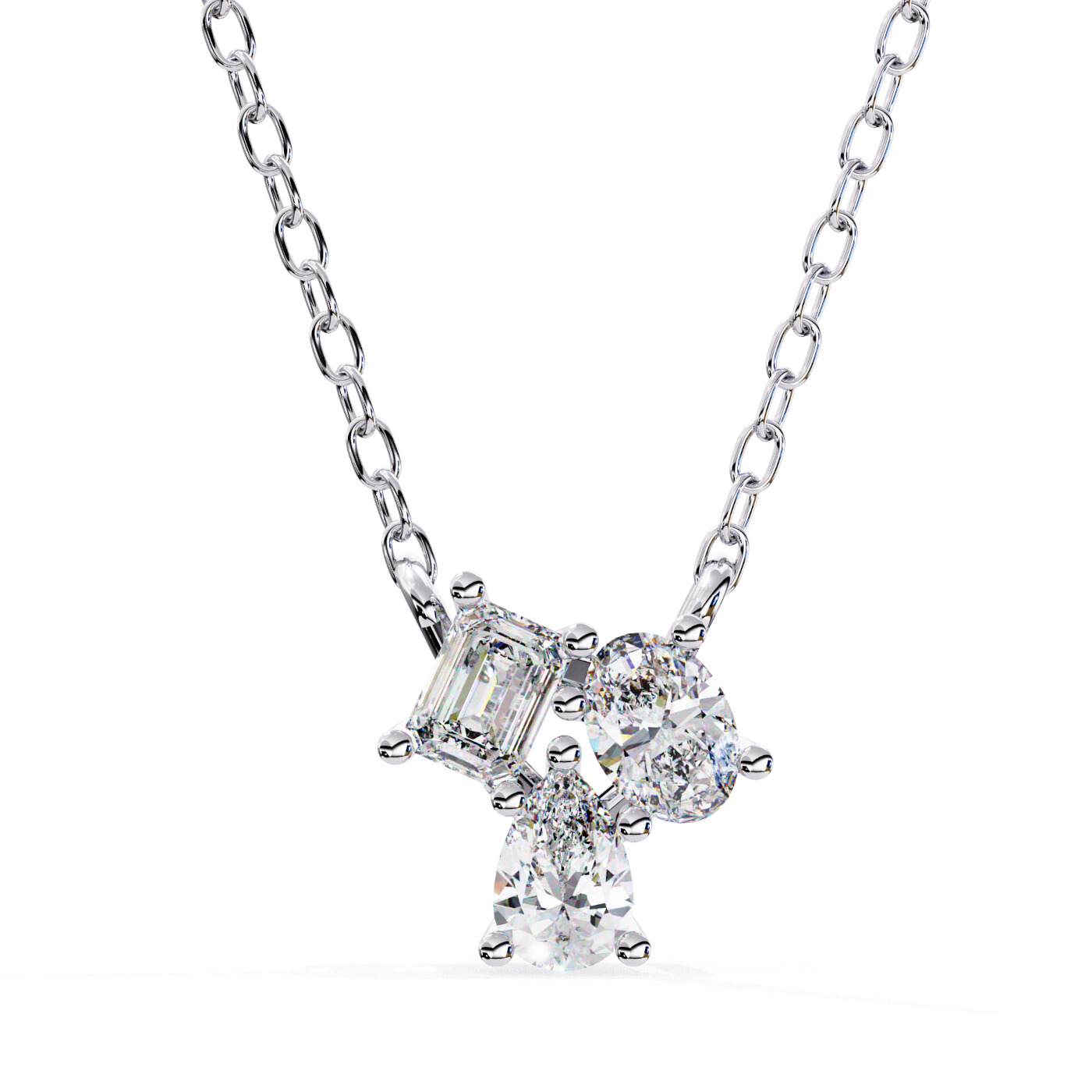 The Trio Gem Pendant combines three distinctive diamond cuts — oval, pear, and emerald — in a unique clustered design. Set in warm yellow gold, this piece radiates modern elegance and is perfect for adding a refined touch to your look.