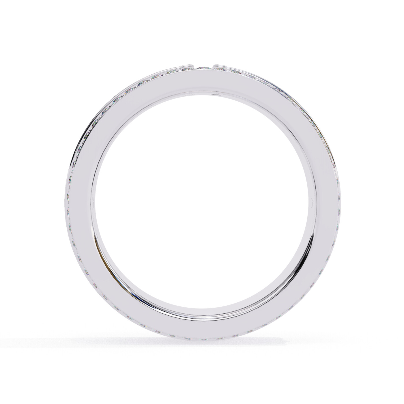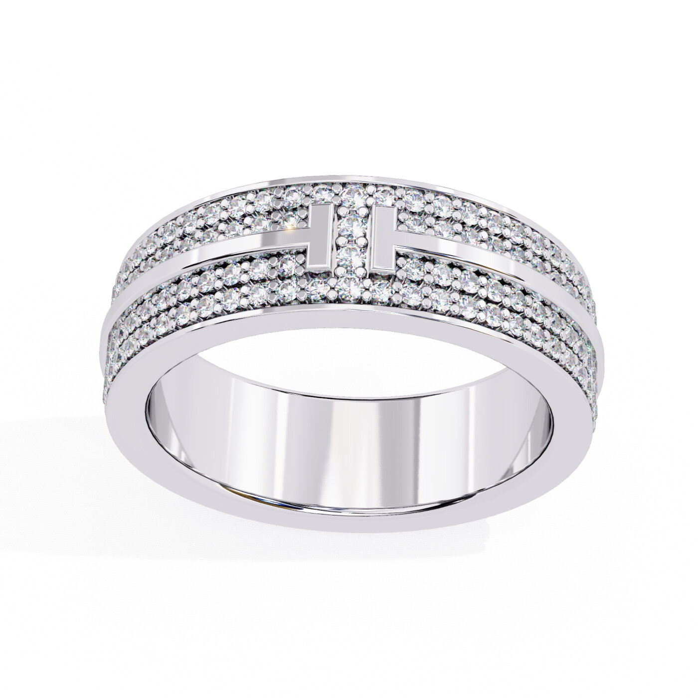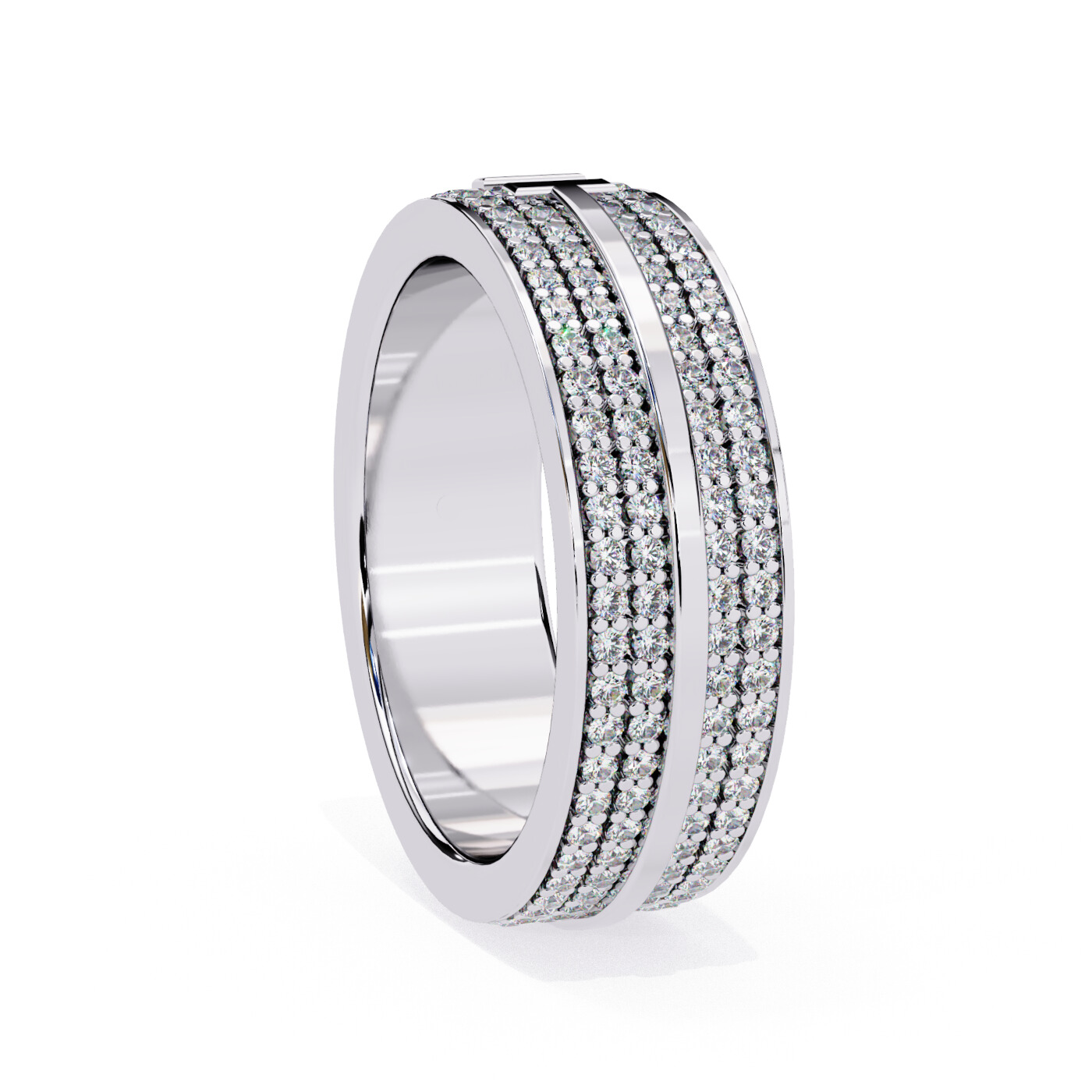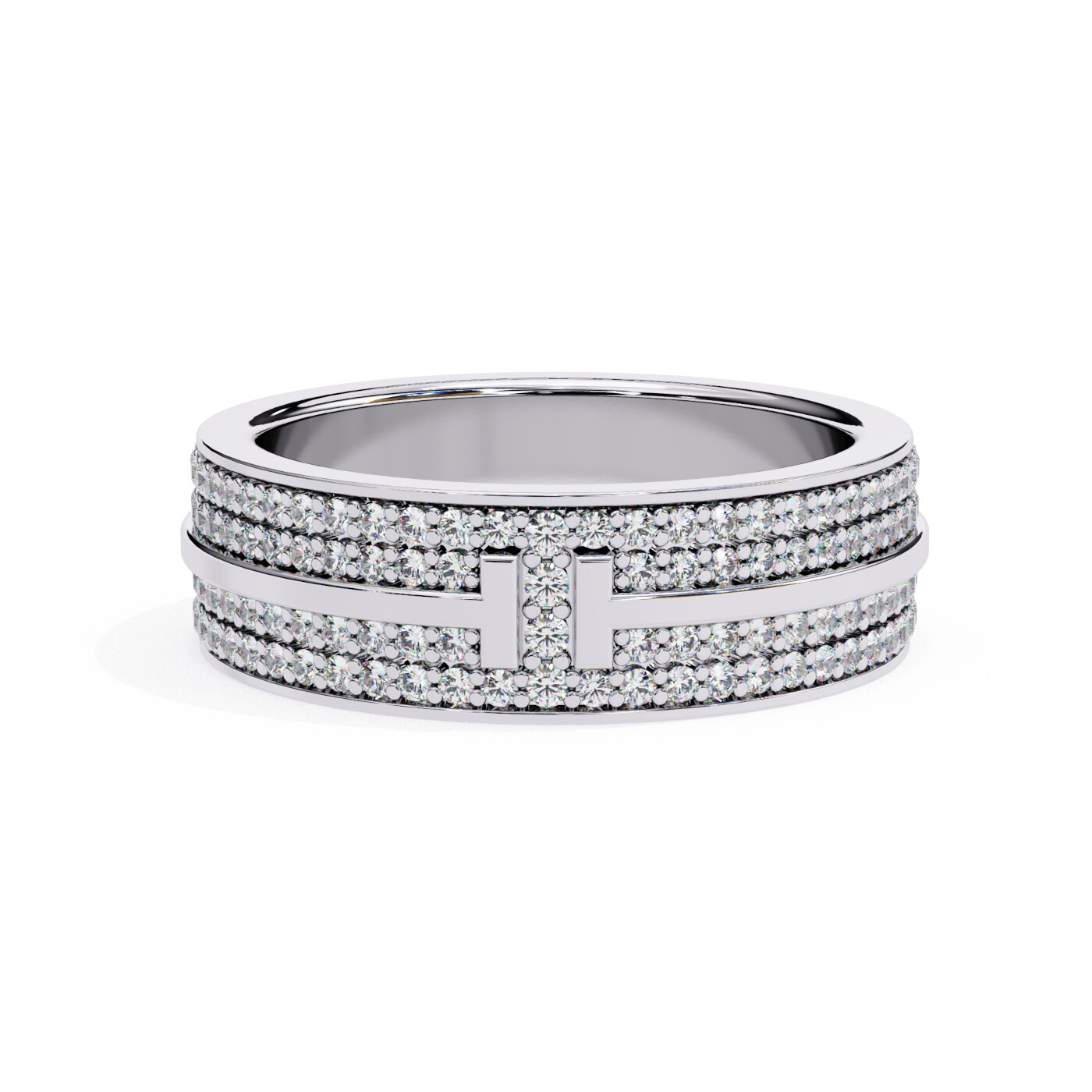 This elegant band showcases three rows of shimmering lab-grown diamonds, accented with a sleek twin-bar design in the center. A blend of modern lines and intricate sparkle makes it perfect for everyday wear or as a unique wedding band.
