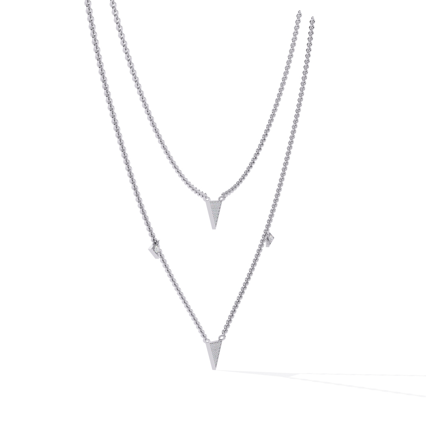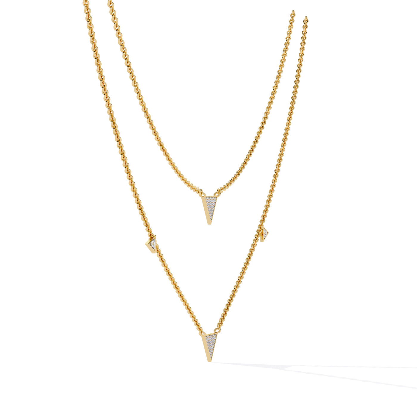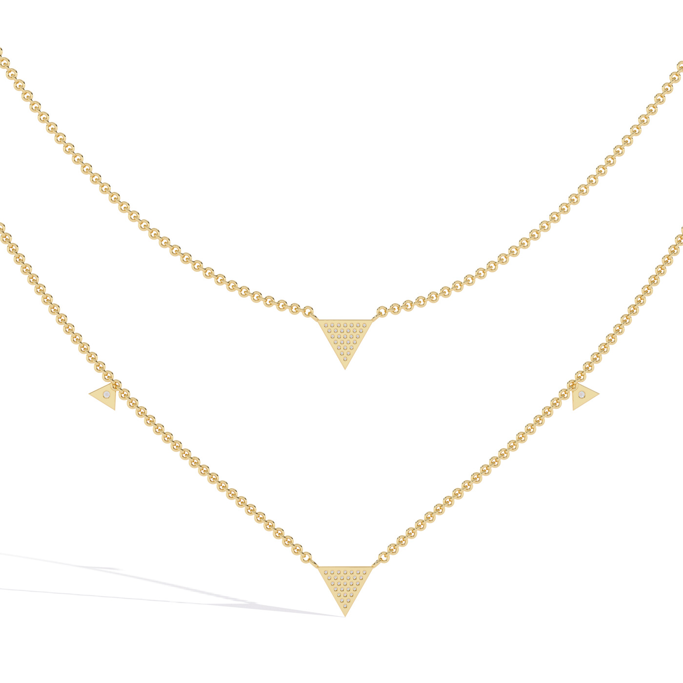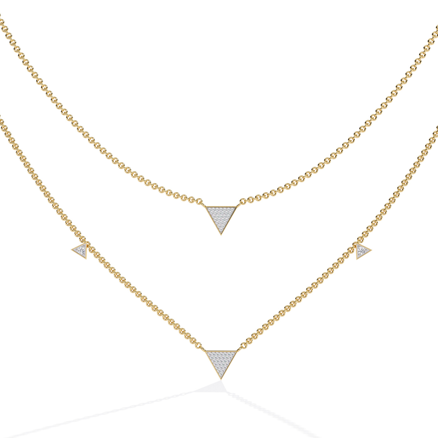 Modern minimalism meets subtle sparkle in the Vira Triangle Layered Necklace. Crafted in 14K yellow gold and studded with fine lab-grown round diamonds, this geometric design makes a bold yet wearable statement—perfect for layering or wearing solo.
